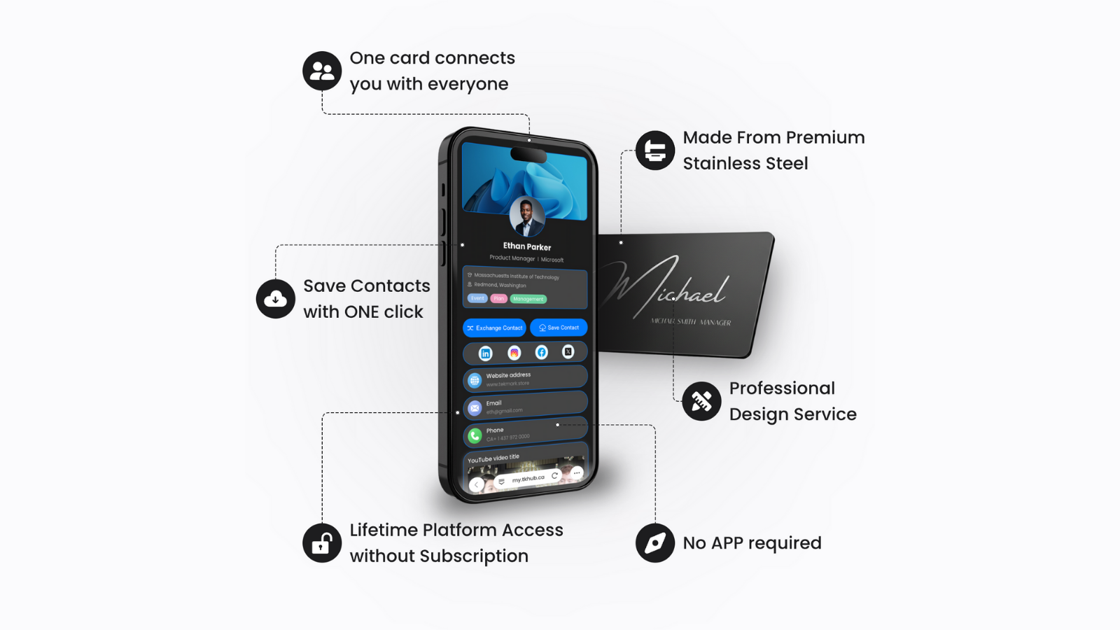 Designed to feel premium in hand and built to last, it’s the modern, eco-friendly alternative to paper business cards—perfect for professionals who want a sharper first impression.
